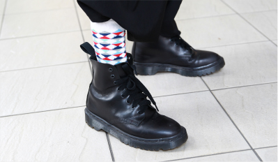 今年正式進入寬褲流行,Y.S以不對稱的幾何剪裁為寬褲提升設計感,Atti特愛搭配花俏的襪子,讓跳躍的反差點綴。
